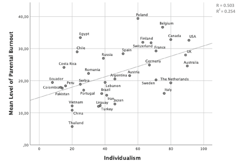 図1 個人主義傾向と子育てバーンアウト得点の散布図